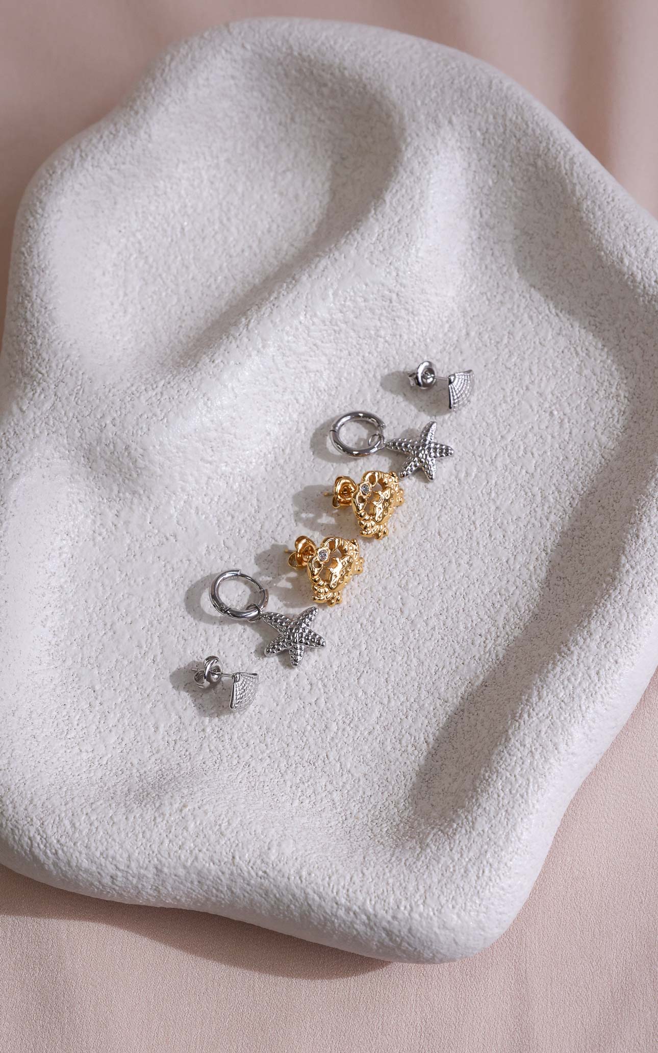 – Gold textured crab holding a diamante stud, silver textured seashell stud and silver textured starfish charm hoop design